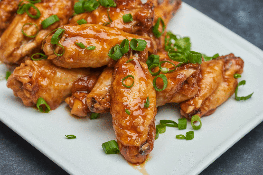 - Toss the cooked wings in sauce; garnish with scallions and sesame seeds.