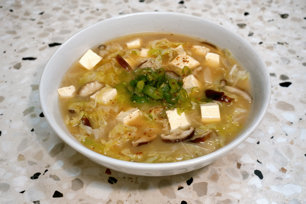 - Add tofu and napa cabbage, simmer 5-10 minutes until cabbage softens.