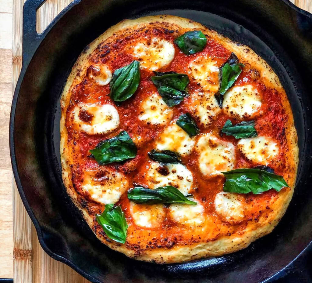 Cast-iron Skillet Margherita Pizza with tangy tomato sauce, creamy fresh mozzarella, and fragrant basil. Crisp, chewy crust complements the gooey cheese and fresh toppings perfectly.