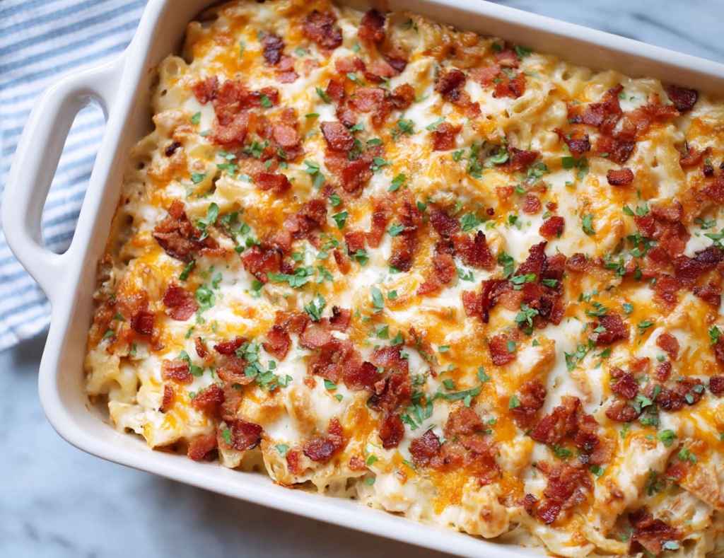 Chicken Bacon Ranch Casserole with creamy Swiss cheese, savory bacon bits, and tangy ranch seasoning, finished with a golden, melted cheese topping.