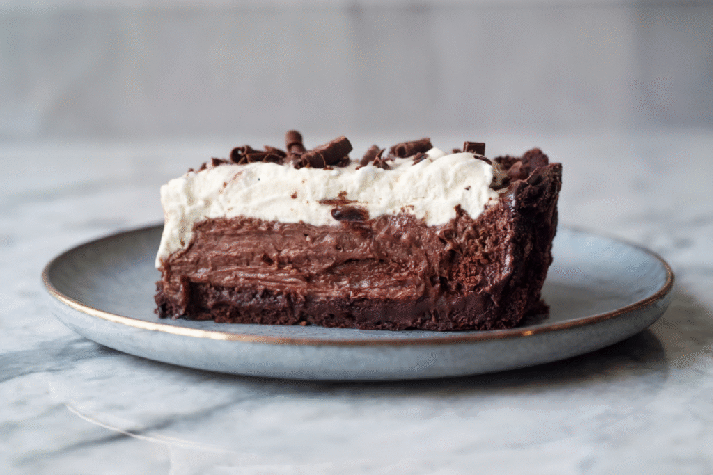 You can either spread the whipped cream over the top of the pie or pipe it on. Garnish with chocolate shavings, which you can make by running a vegetable peeler along the side of a bar of chocolate.