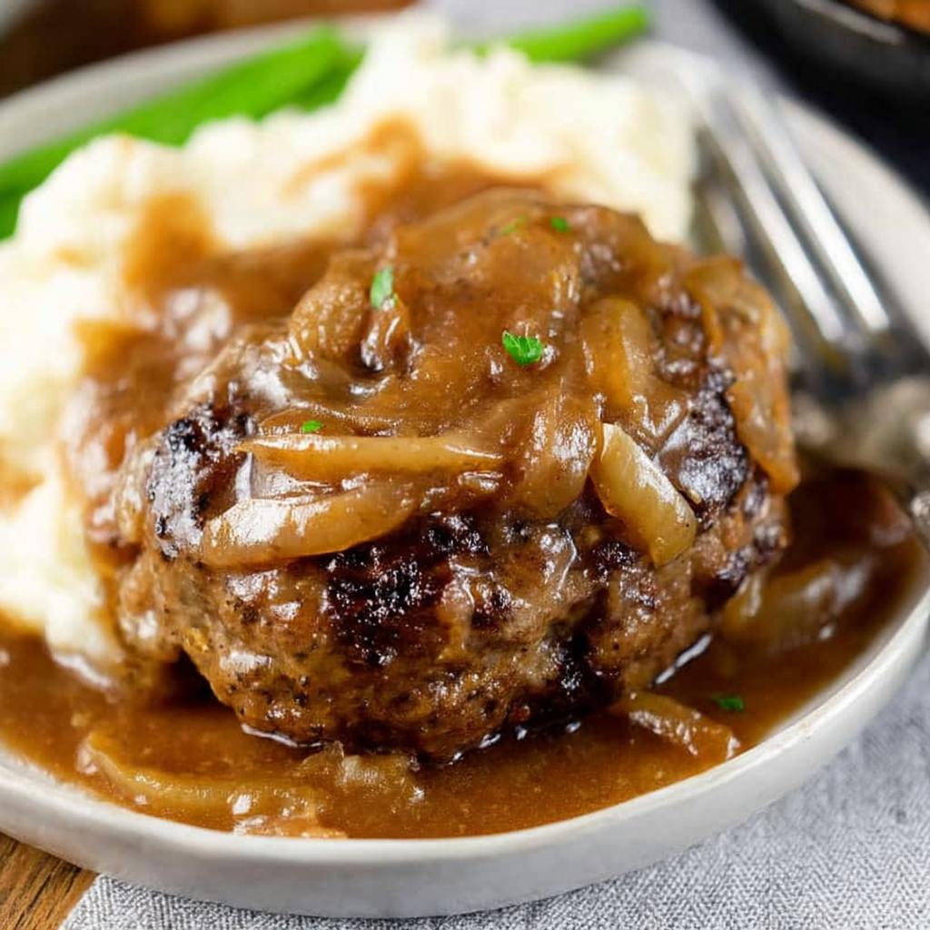 Hamburger steaks with onion gravy combine savory beef patties with a rich, buttery onion gravy. The tender steaks harmonize perfectly with the sweetness and depth of caramelized onions, creating a comforting, flavorful meal.