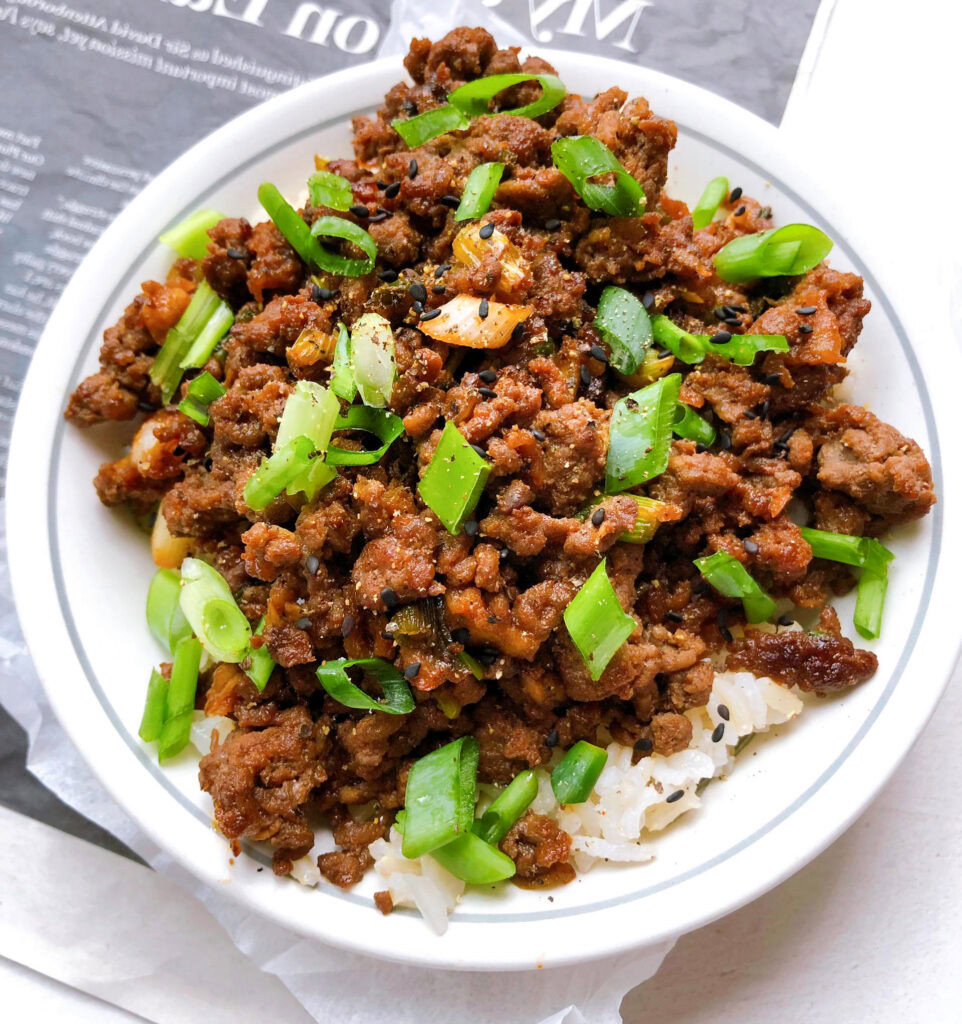 Korean Ground Beef Over Rice with sweet, savory, and spicy notes from garlicky beef caramelized in brown sugar, soy sauce, and gochujang. Crisp broccoli slaw and tangy pickled cucumbers add freshness and crunch.