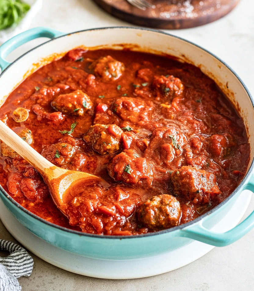 Transfer the baked meatballs to the pot with the marinara sauce and let simmer for 15 minutes.