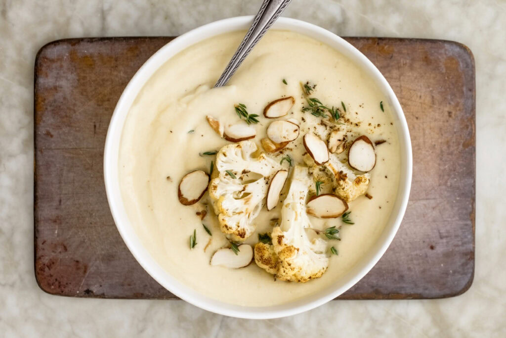 Set aside a few of the best-looking cauliflower florets for garnish. Transfer the rest of the roasted cauliflower to a blender.