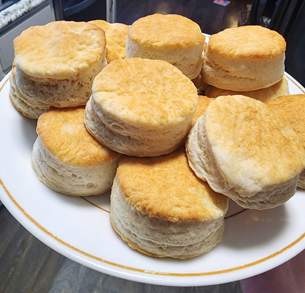 Homemade biscuits with a soft, tender crumb and a light golden crust. Rich with buttery notes, they offer a satisfying blend of mild sweetness and a hint of salt.